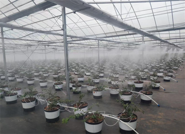 如今在大棚里,藍莓樹苗不是直接種在地里,而是種在一個個種植盆里,種植盆直徑約40厘米,里面裝的不是土壤,而是由草炭、椰糠、樹皮等材料組成的基質(zhì),并且在種植盆下方有防水布覆蓋了整個大棚,解決了土壤污染問題。